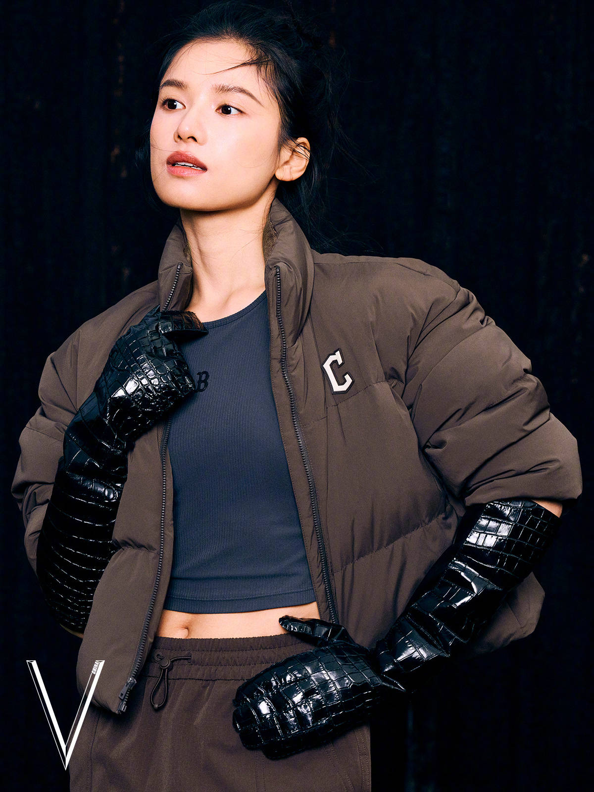 张婧仪穿黑色皮风衣,眼神坚定。