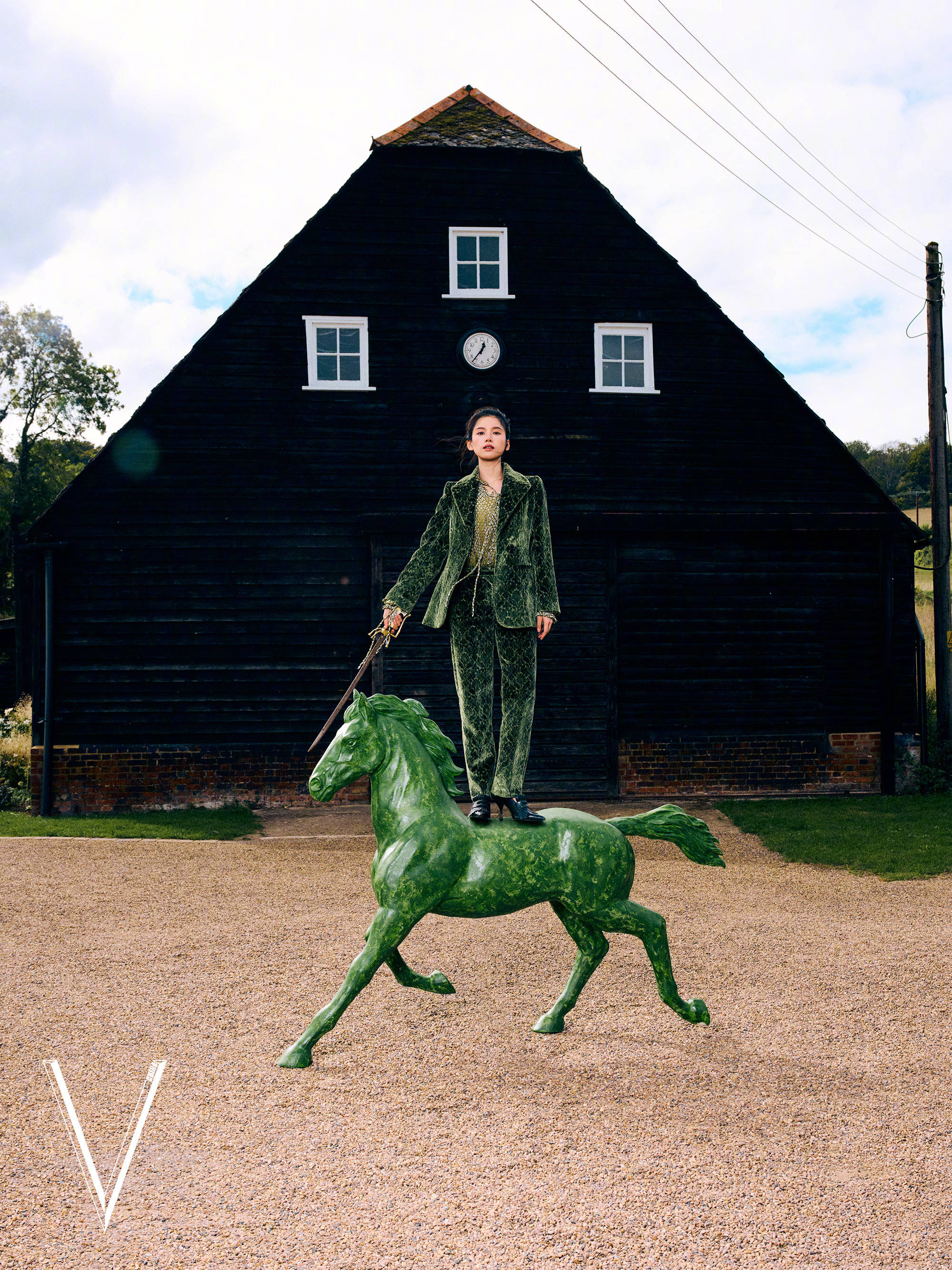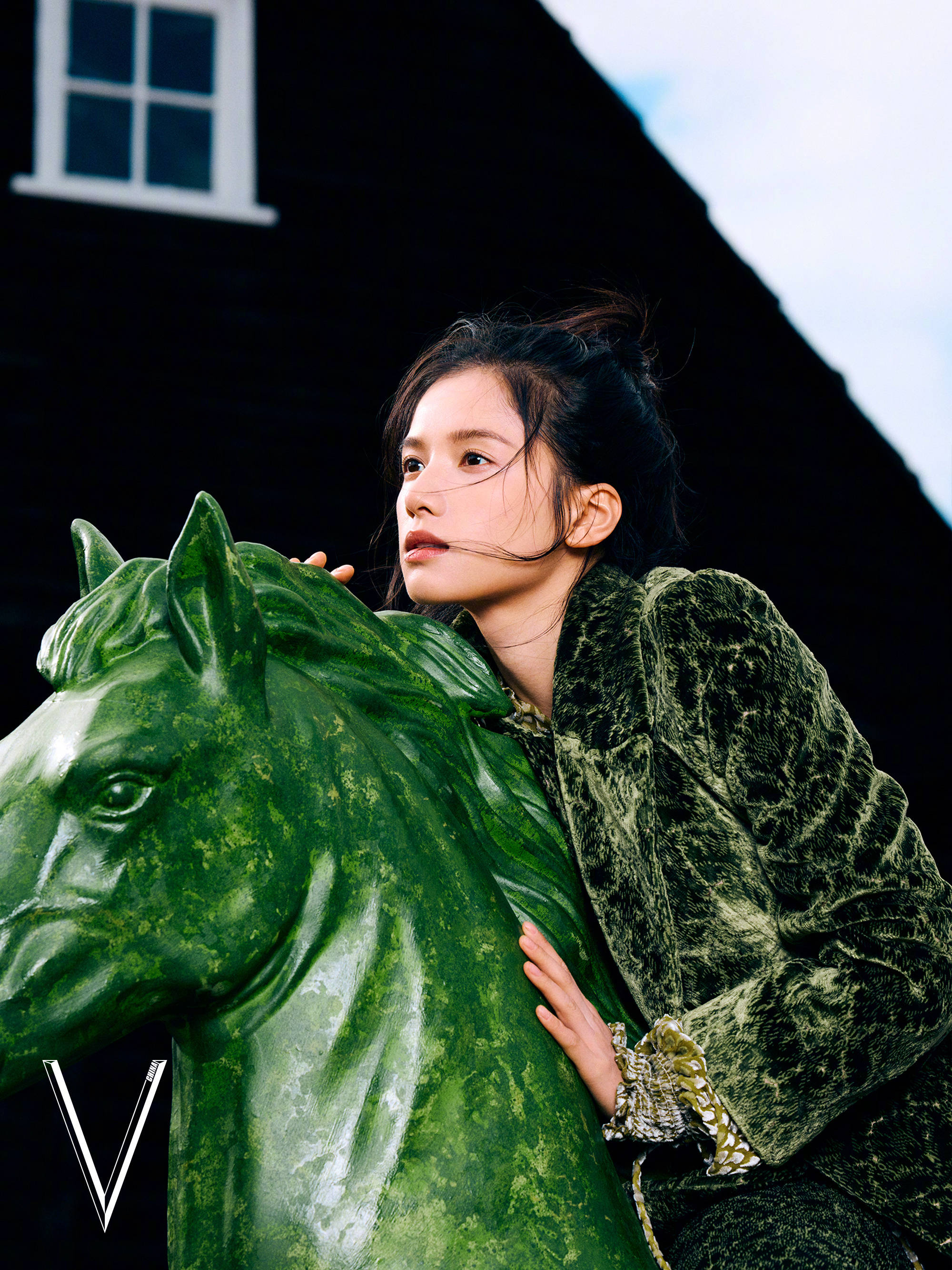 张婧仪穿绿色丝绒套装,依偎在绿色木马旁。