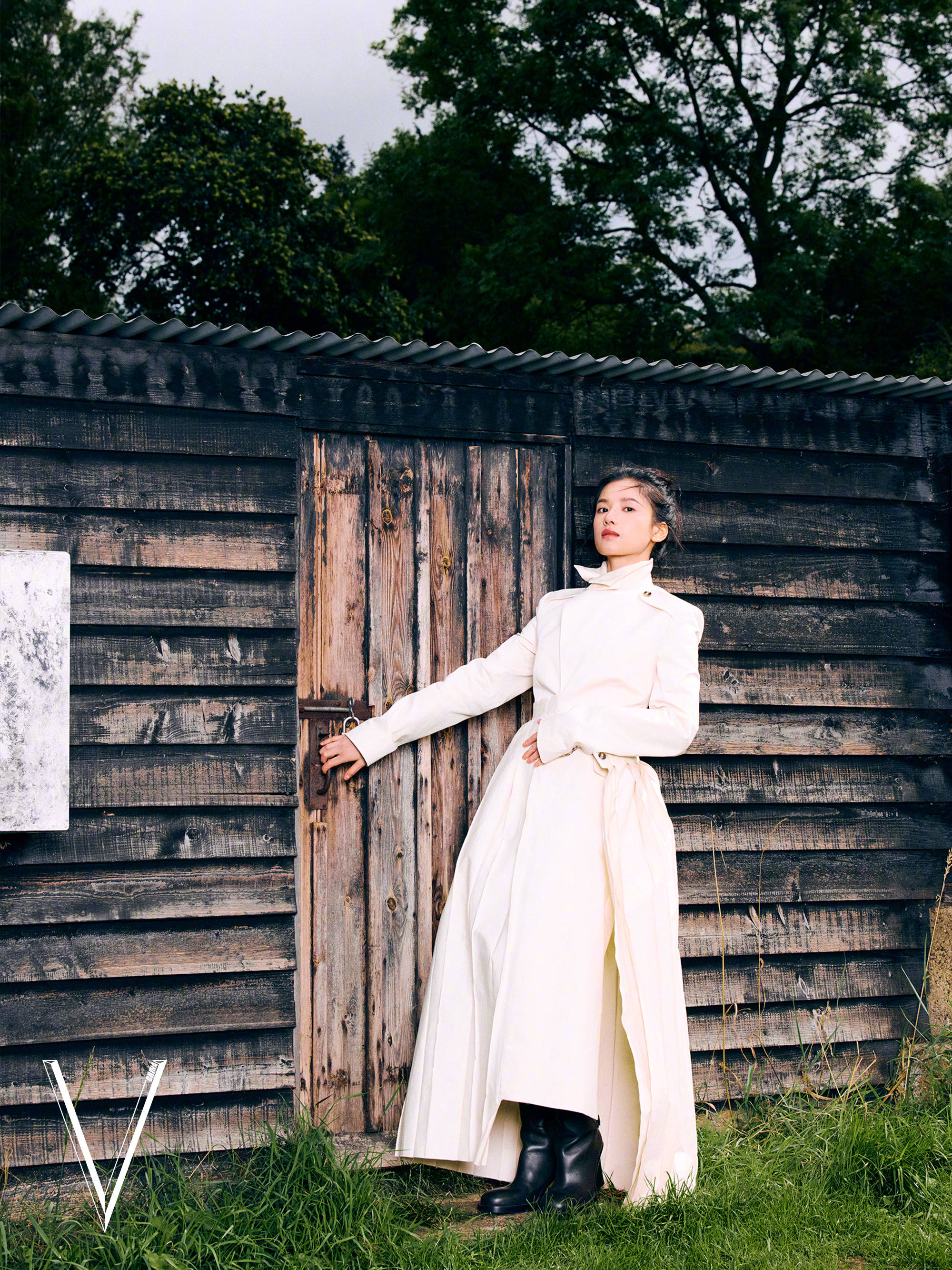 张婧仪穿白色长款风衣,姿态优雅。