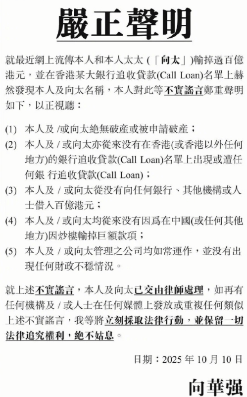 搜狐娱乐讯 10月10日,向华强在香港登报发声明否认破产。声明中否认网络上流传的“向华强及向太赌输百亿、被追收贷款”传闻, 称从来没有在任何地方因炒楼输掉巨额款项,不实谣言已交由律师处理。