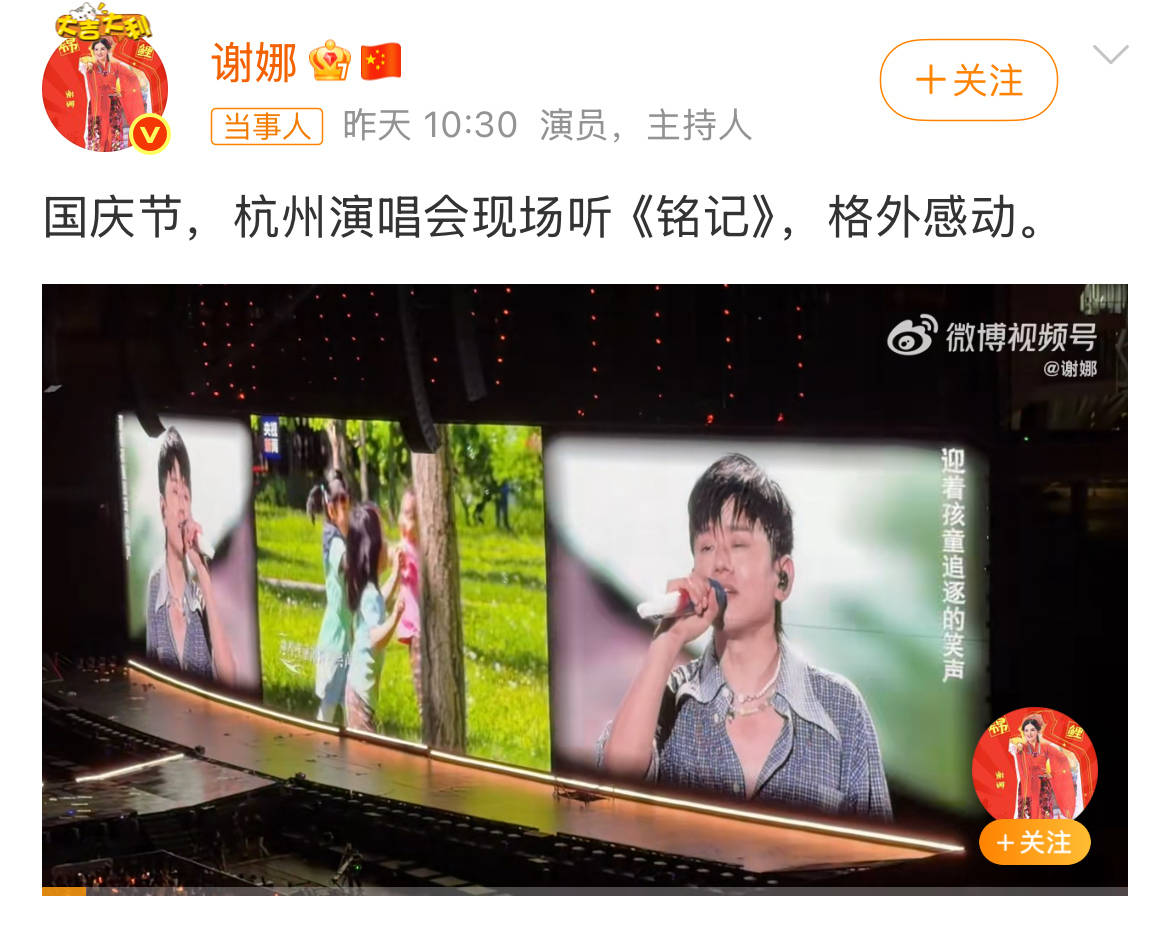 10月3日当天,谢娜还发博晒出张杰演唱会视频,配文“国庆节,杭州演唱会现场听《铭记》,格外感动。”据了解,《铭记》为纪念抗战胜利80周年创作,曾获央视官方点赞,在国庆节唱响,也具有特殊意义。