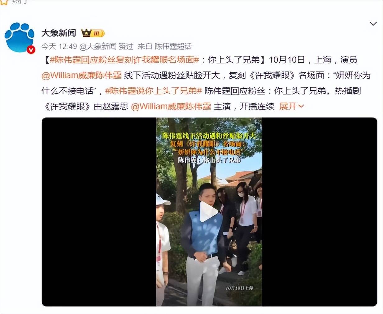 10月10日,陈伟霆在上海参加线下活动现场遭遇戏剧性一幕。当他参与活动时,现场突然有男粉丝高声喊出热播剧《许我耀眼》中的经典台词:“妍妍,你为什么不接电话!”这句出自剧中沈皓明醉酒追妻名场面的台词,让陈伟霆先是愣住片刻,随即忍俊不禁地摇头回应:“你上头了兄弟!”这段即兴互动瞬间点燃现场气氛。