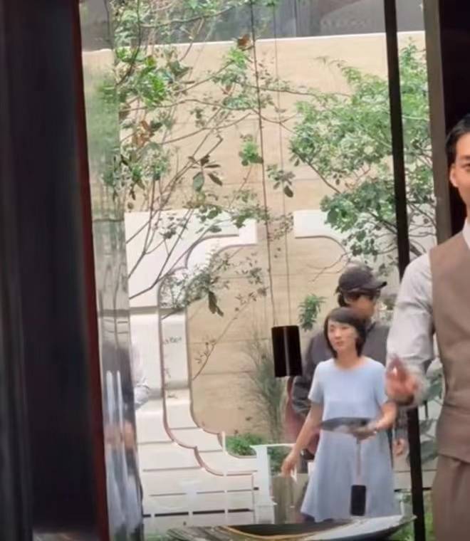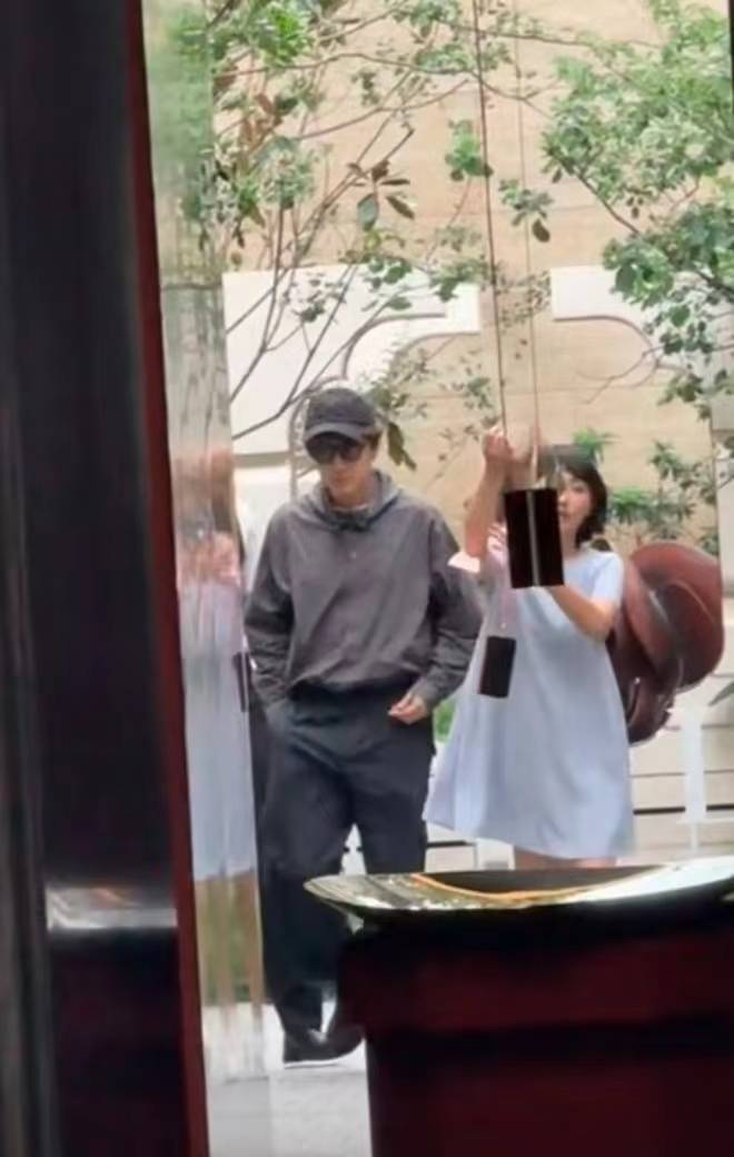 黄曦宁剪短头发,看起来依然很精干,胡歌走在身后。