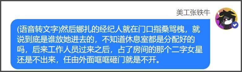 但娜扎这个咖位还是能混上休息室的,当时活动的那一层,有3个休息室,房门上都会提前写好艺人名字。但不知道为什么,娜扎却被一个“二字话题女星”占了休息室,还反锁了,而且不管外面工作人员怎么哐哐砸门,怎么骂,这位二字女星就是不出来归还休息室,娜扎只能先借用隔壁某男星的休息室。