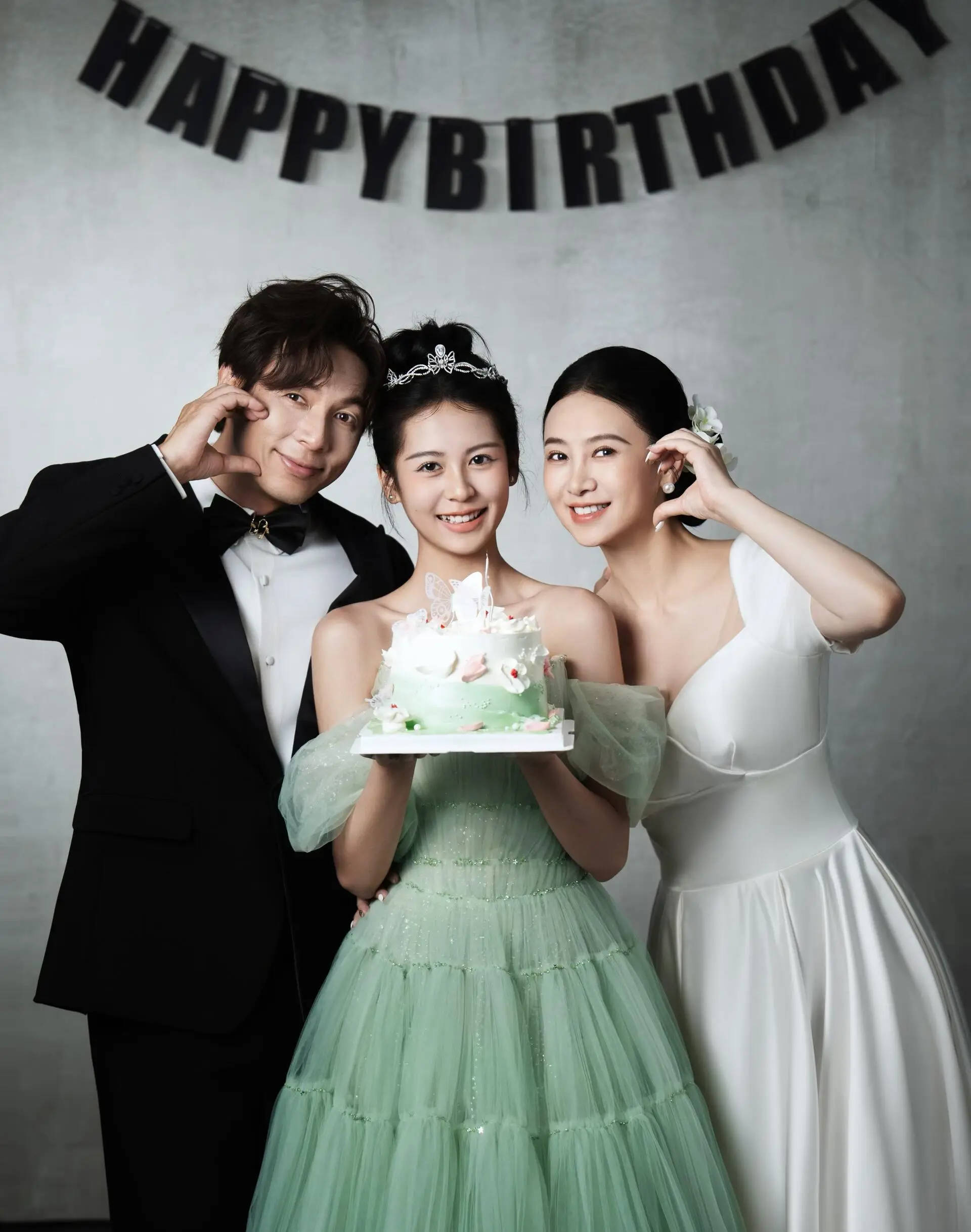 翁虹夫妇站在女儿身旁比心,氛围温暖甜蜜。