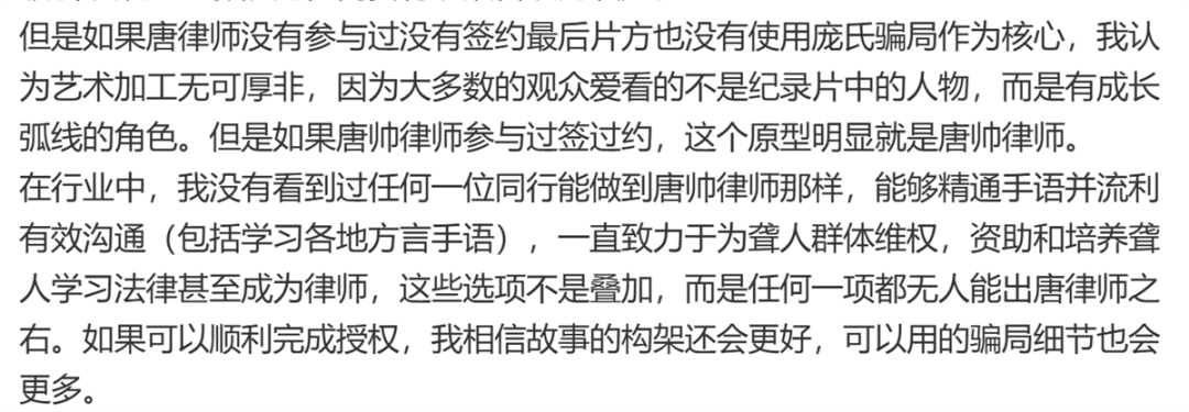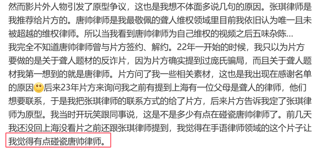 最后一点,片方宣传的中国有“20个手语律师”,似乎是别有用心(为的是跟唐帅切割做准备),并涉及虚假宣传。