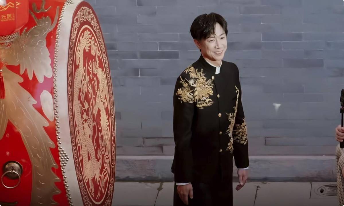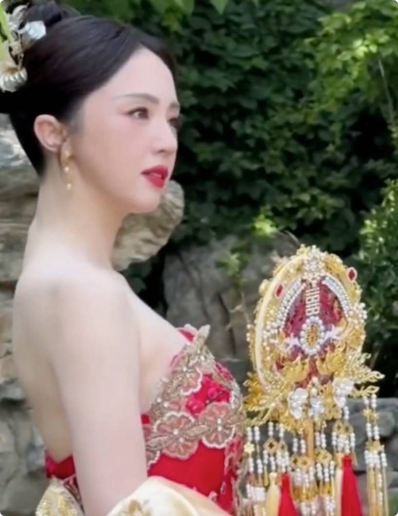 从视觉呈现来看,二人仿佛来自平行时空。董璇一袭绛红抹胸礼服,金钗步摇流光溢彩,执双喜团扇的姿态宛如从古画中走出的贵妇。岁月似乎对她格外宽容,46岁的面容依旧光彩照人。反观张维伊,简约的着装风格使他更像是个误入镜头的侍从,在画面中被动地扮演着守护女王的侍卫角色。