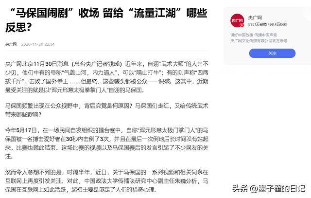 就在马保国靠“出糗”吸粉无数的时候,麻烦来了,央视直接点名批评他了。