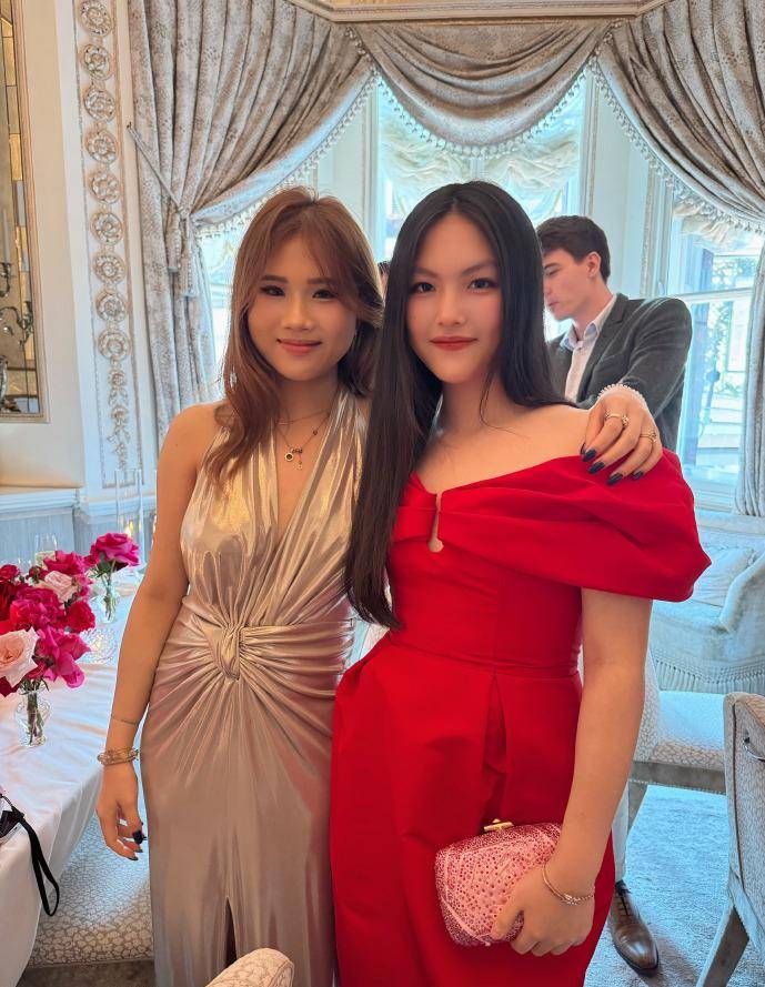 一向喜欢鲜艳颜色的李湘,挑选了一件印花浅色礼裙,和手中的鲜花正好匹配,母女俩都留着披肩长发,更像是一对姐妹花,气质、身材都很相似。