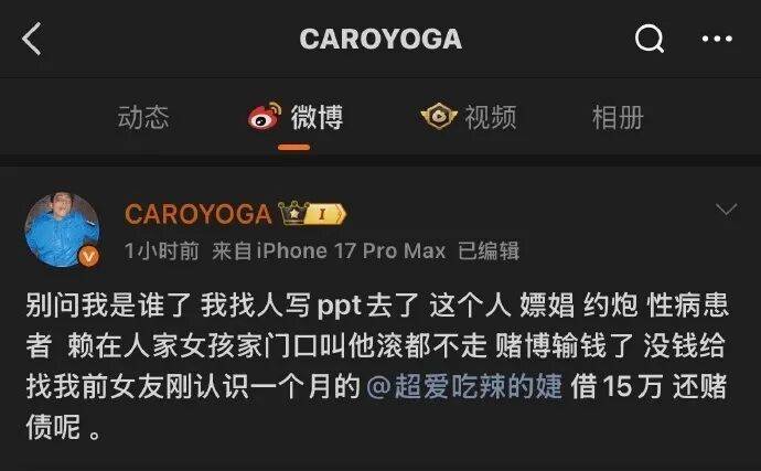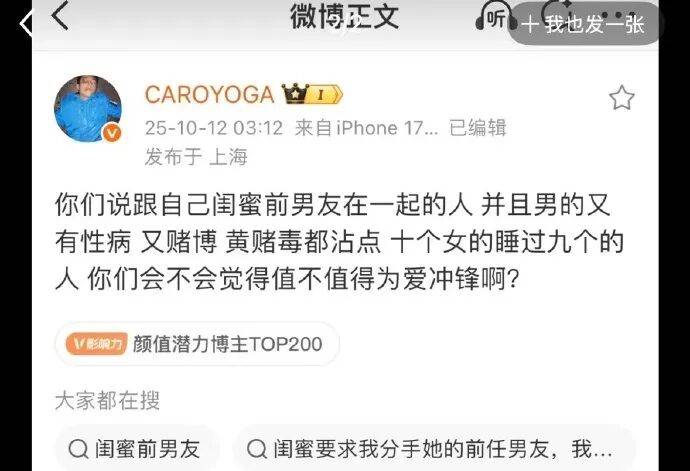 2025年10月12日凌晨,网红树一(微博账号@CAROYOGA)突然发文官宣与女友慎婕分手,称其为“前女友”,并指控慎婕与“闺蜜前男友”交往,且该男性涉嫌黄赌毒、传播性病、赌博欠债等行为。