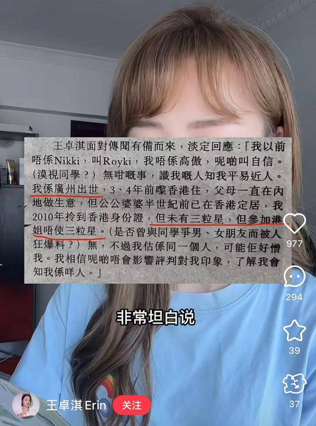 王卓淇称当年因为这份诚实,遭到不少香港人的质疑,当时很多人认为她是广州人,怎么能成为香港小姐。