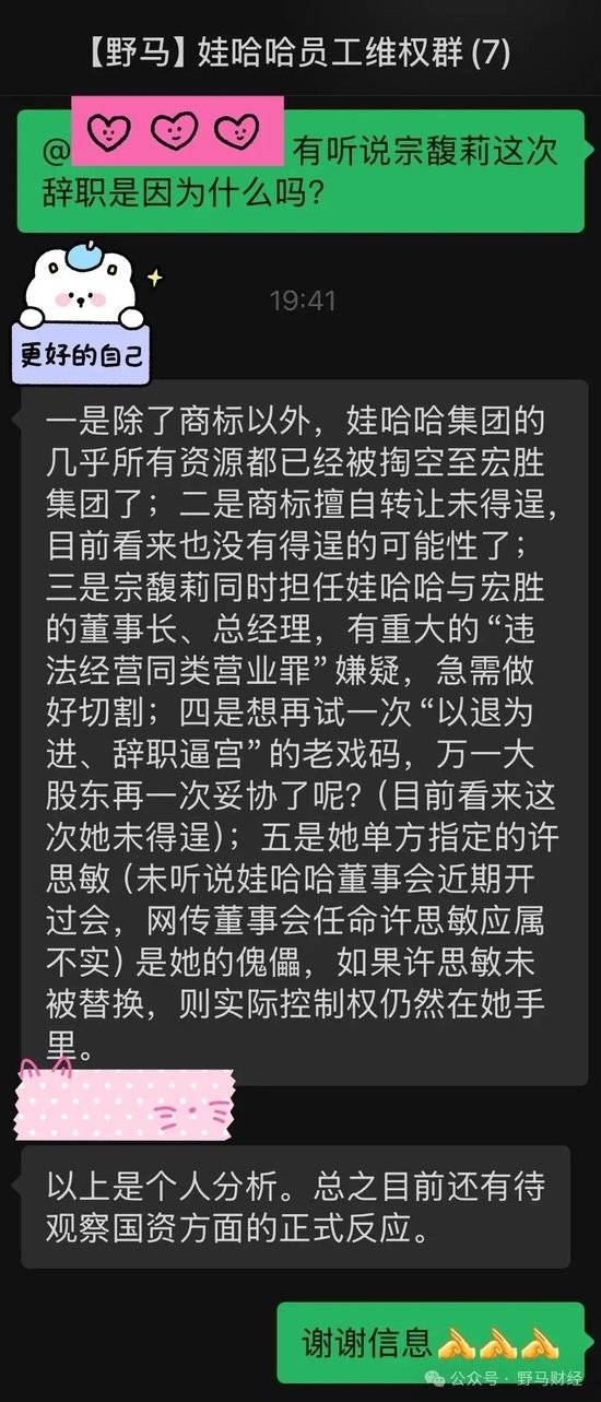 对于宗馥莉这次辞职,该员工个人还认为,“一是除了商标以外,娃哈哈集团的几乎所有资源都已经被掏空至宏胜集团了;二是商标擅自转让未得逞,目前看来也没有得逞的可能性了;三是宗馥莉同时担任娃哈哈与宏胜的董事长、总经理,有重大的‘违法经营同类营业罪’嫌疑,急需做好切割;四是想再试一次‘以退为进、辞职逼宫’的老戏码,万一大股东再一次妥协了呢?”