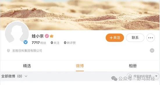 目前,“娃小宗”已经注册了自己的官方微博,且微博账号完成平台认证,认证主体为宏胜饮料集团有限公司,该账号的审核通过时间为9月30日。截至10月11日下午,娃小宗的微博账号尚未更换头像和发表内容,但粉丝数量已经超过7000。