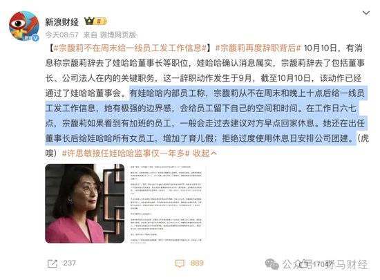 不过依然有网友对宗馥莉持支持态度,认为“大女主”是在拿回她应得的。还有娃哈哈内部员工对宗馥莉的工作表示认可,称宗馥莉从不在周末和晚上十点后给一线员工发工作信息,她有极强的边界感,会给员工留下自己的空间和时间。在工作日六七点,宗馥莉如果看到有加班的员工,一般会走过去建议对方早点回家休息。她还在出任董事长后给娃哈哈所有女员工,增加了育儿假;拒绝过度使用休息日安排公司团建。