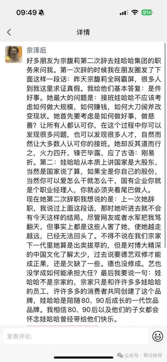 如今宗馥莉第二次从娃哈哈集团辞任,宗泽后再次从朋友圈发表评论。他写道:“尽管网友或者水军把我骂翻天,但事实上都是这些人害了她,使她越走越远,已经无法回头了。不得不说在我们宗家下一代里她算是出类拔萃的,但是对博大精深的中国文化了解太少,过去说要德艺双修才能成正果,还是欠缺了一些。德也没修成。艺也没学成如何能承担大任?最后我要说一句:娃哈哈不是宗家的,宗家只是和许许多多娃哈哈的员工,许许多多的消费者共同创建了这个品牌,娃哈哈是陪随80、90后成长的一代饮品品牌。我相信80、90后以及他们的子女都会怀念娃哈哈曾经带给他们快乐。”