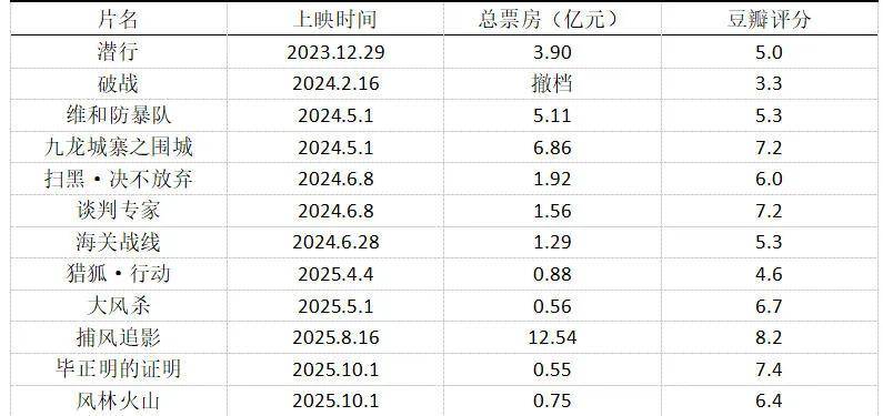 自2024年元旦档至今,中国电影市场在各档期共上映警匪片12部(截至本文统计时间)。其中评分达到7.0以上的作品仅有4部,口碑票房双收的更是屈指可数。