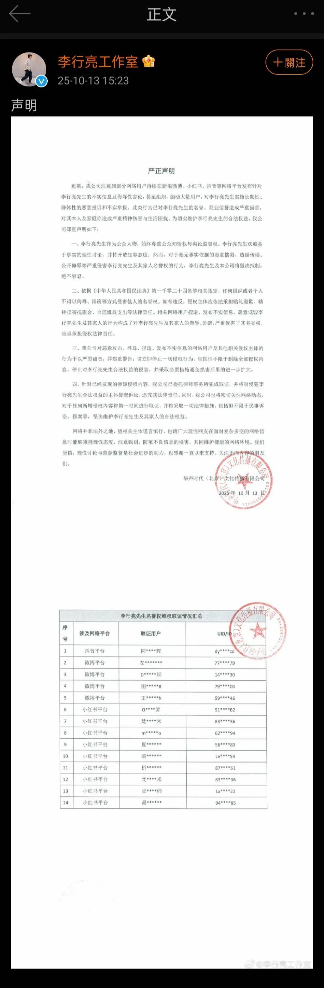 李行亮工作室也同步于10月13日发布了声明,声明称,相关网络行为严重损害李行亮名誉、商业信誉,对其本人及家庭造成精神伤害与生活困扰,针对网络用户发布李行亮不实信息、侮辱言论及组织恶意投诉举报等行为,坚决维护其合法权益。