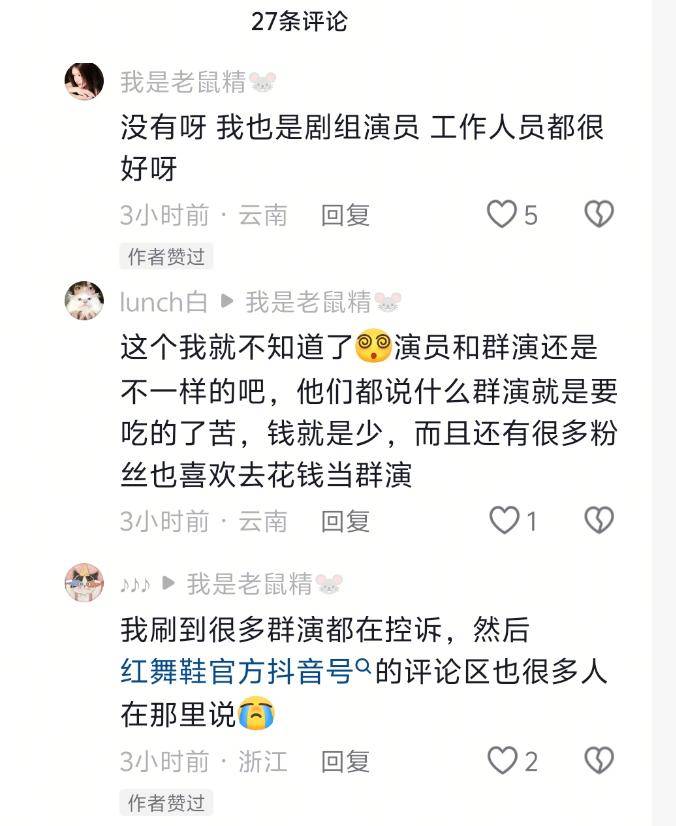 于是有吃瓜群众好奇的询问这位群演,剧组的氛围是否有网传的那么不堪?评论区里几个群演现身说法,表示剧组氛围还挺好的,让网友一时之间也不知道该信谁了。