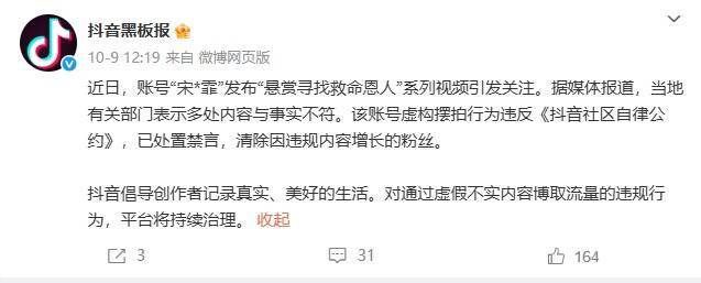 近日,账号“宋*霏”发布“悬赏寻找救命恩人”系列视频引发关注。据媒体报道,当地有关部门表示多处内容与事实不符。该账号虚构摆拍行为违反《抖音社区自律公约》,已处置禁言,清除因违规内容增长的粉丝。