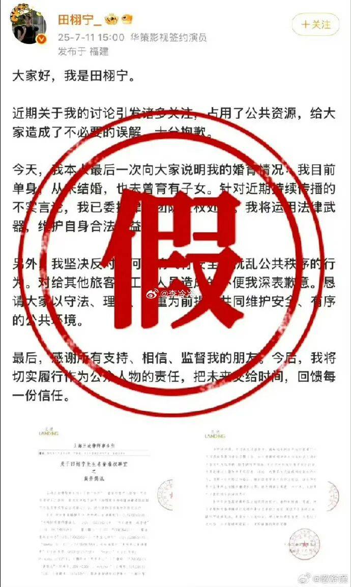 2025年7月11日,田栩宁发布声明,强调“单身未婚未育,从未结婚且无子女”,并启动法律程序起诉造谣账号。