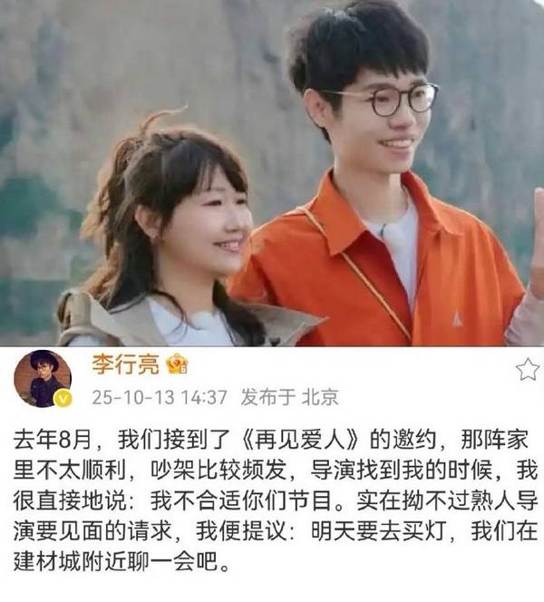 李行亮与麦琳因参加婚姻观察类综艺《再见爱人4》(2024年10月播出)陷入长期网暴。节目中两人的婚姻矛盾被剪辑放大,引发观众对其"畸形婚恋观""按剧本炒作"的质疑。尽管节目已收官近一年,网暴仍未停止。其中的酸甜苦辣怎么能通过几期节目简简单单就让外人看得出来呢?