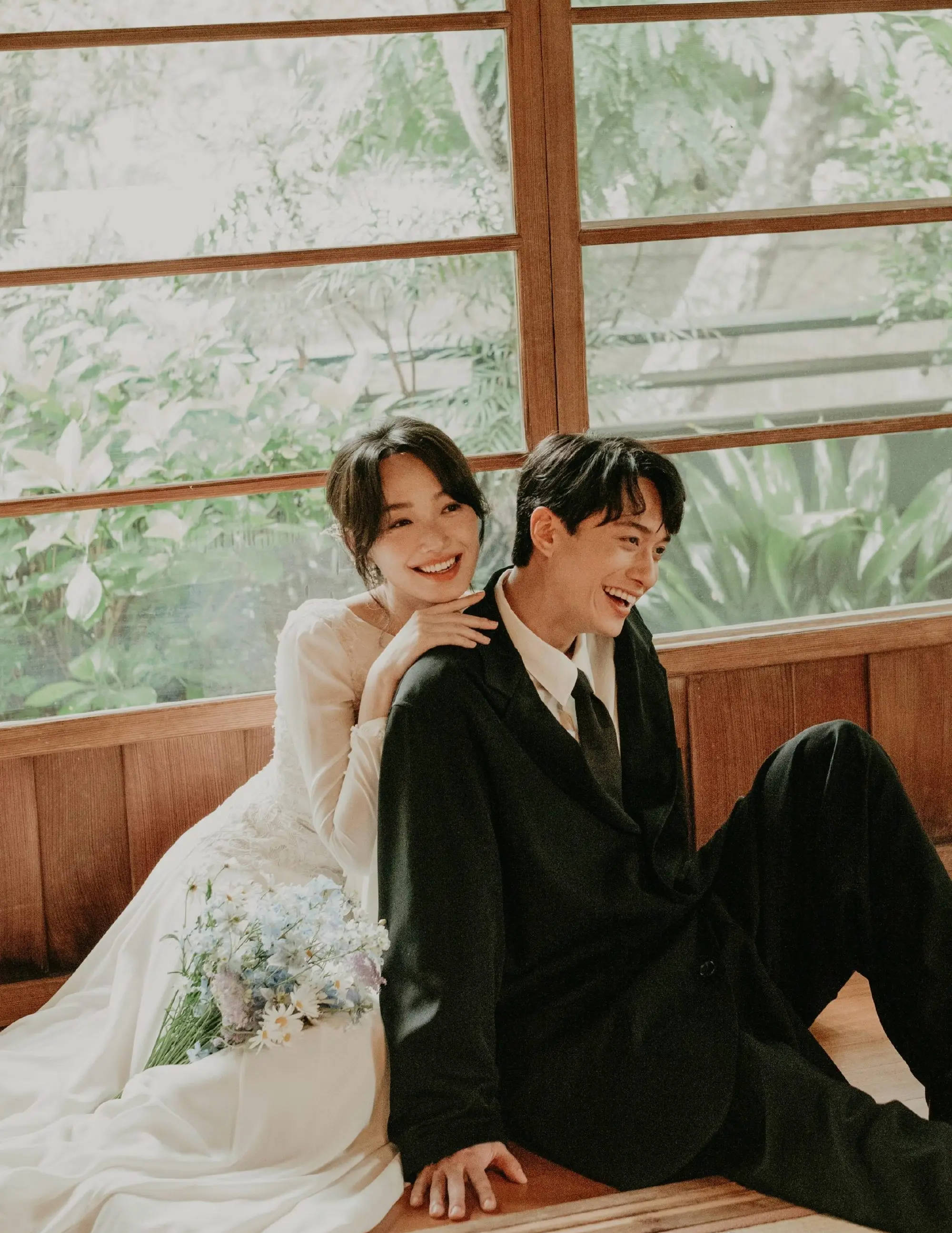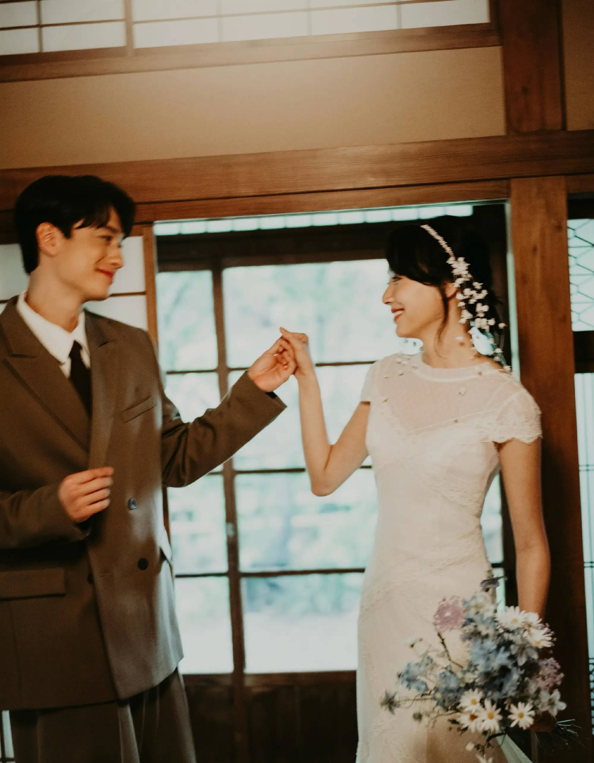两人手拿鲜花笑容灿烂。