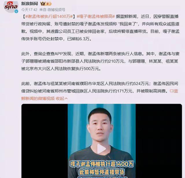 官宣退网10天后,有新闻记者查询企查查,发现谢孟伟多了两条被执行人信息,金额加起来710万元。