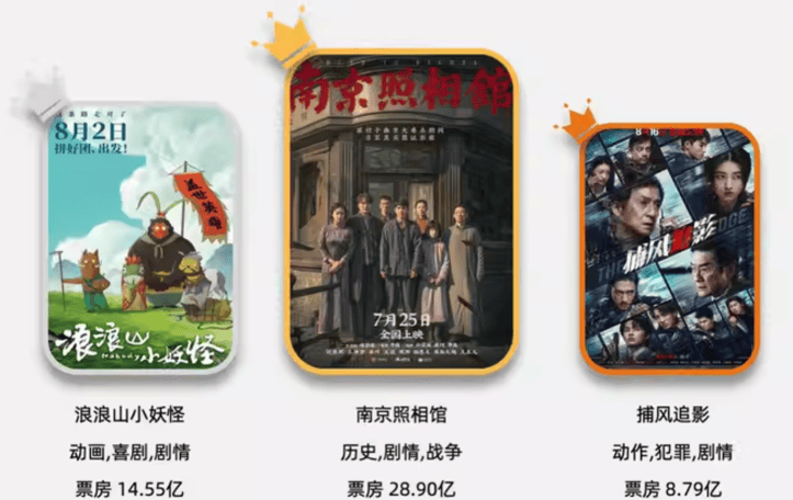 暑期档票房前三名《南京照相馆》《浪浪山小妖怪》《捕风追影》豆瓣评分均在8分以上,最低的《捕风追影》都有8.2,其它能够在一定程度上破圈的电影,如《F1:狂飙飞车》《罗小黑战记2》,豆瓣评分也都在8分以上。