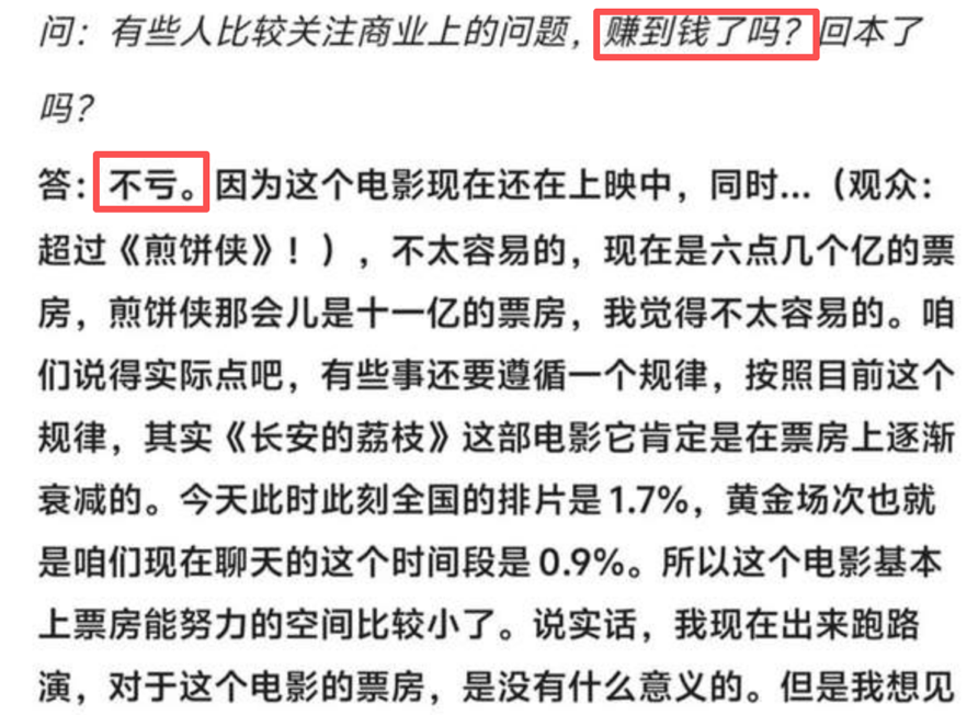 不管是因为题材、时间,还是因为剧版《长安的荔枝》没能让观众喜欢,都无法否认,有相当一批观众对这部电影不感兴趣。相比起《长安的荔枝》的成本而言,这部电影在商业上只能如大鹏本人所说的那样“不亏”。