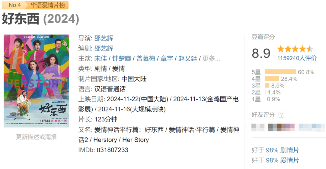 正如他所说,电影有成功就有失败,麦特在2024年主控的《好东西》便成为冷档期的黑马,以中小成本的投资,不仅斩获了7亿+的票房,豆瓣评分还一度高达9.0,与《我不是药神》持平。一年后的今天,该片的豆瓣评分也仍然有8.9,放眼2025年,还没有一部能与之相抗衡的片子。