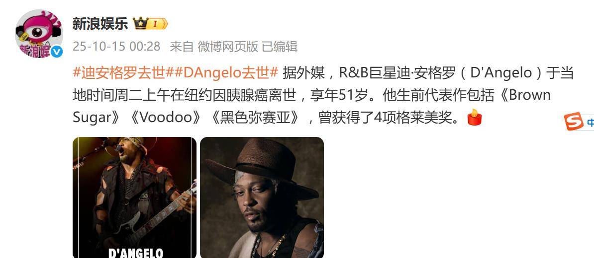 据10月15日报道,曾以《Brown Sugar》《Voodoo》等作品重塑R&B音乐面貌的美国传奇音乐人迪·安格罗(D'Angelo),终究未能战胜病魔。10月14日周二上午,这位新灵魂乐教父因胰腺癌在纽约离世,享年51岁。消息传出,乐迷与音乐人集体哀悼,称这是“灵魂乐界的巨大损失”。