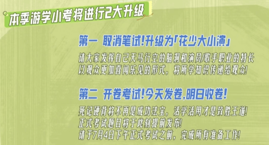 另一方面,在“七老童心”的建议下,《花少7》小考内容从以往的笔试答题,改成了可以充分利用每个人特长的排戏、拍视频等形式——
