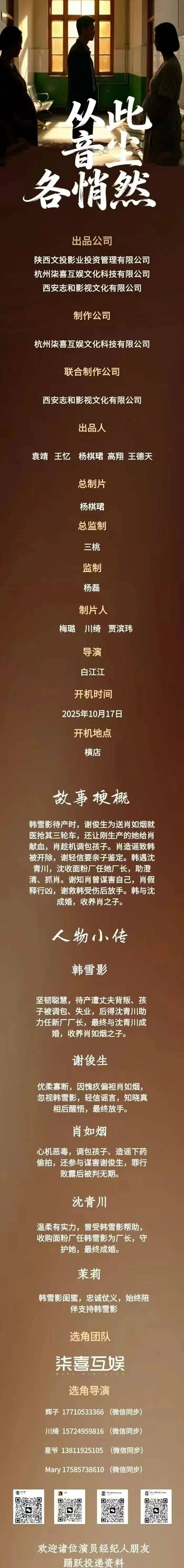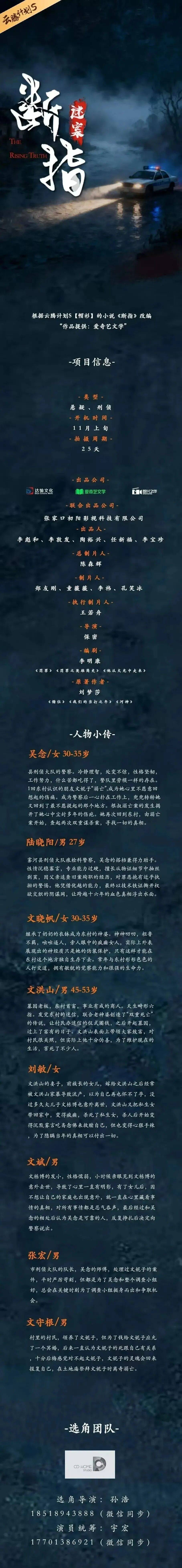 免责声明:戏客Seeker公众号(“本平台”)中全网组讯的信息、内容(“组讯信息”,包括但不限于影视项目名称、项目介绍信息、出品公司信息、导演信息、选角团队信息、拍摄相关信息、联系方式等)均来源于内容信息相关方提供或互联网公开信息。本平台不对组讯信息的真实性、准确性、完整性、及时性、关联性、适用性及安全性提供任何明示或默示的担保。请您谨慎参考或使用组讯信息,并确保您的人身、财产安全,本平台不对您使用或参考组讯信息而造成的后果承担任何责任。