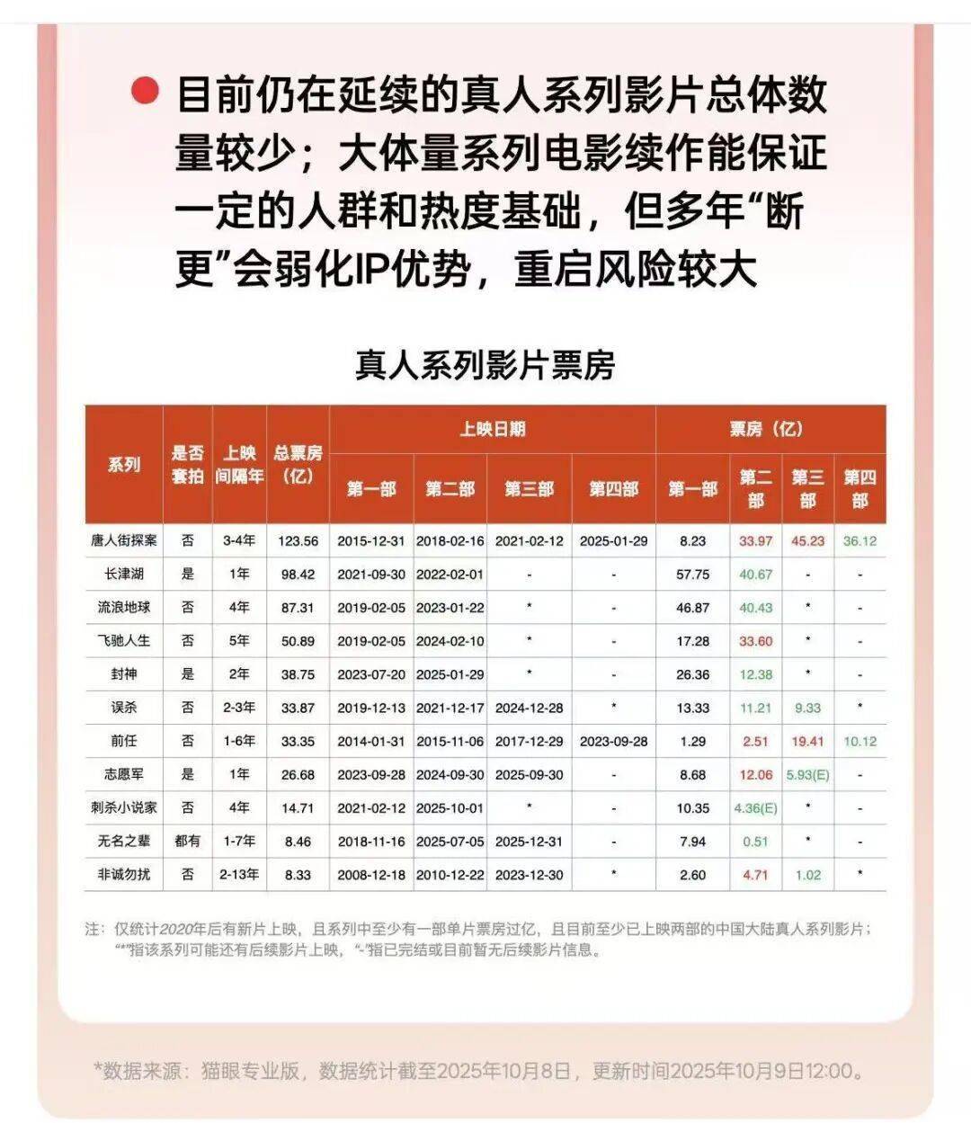 根据《2025国庆档电影数据洞察》研究指出,大体量系列真人电影续作能够保证一定的人群和热度基础,但多年“断更”会弱化IP优势,重启风险较大。
