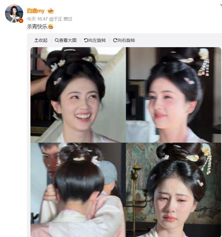 下午,她又发文“杀青快乐”,配了四张片场照——有笑起来眼睛弯成月牙的,有眼尾挂着泪的。