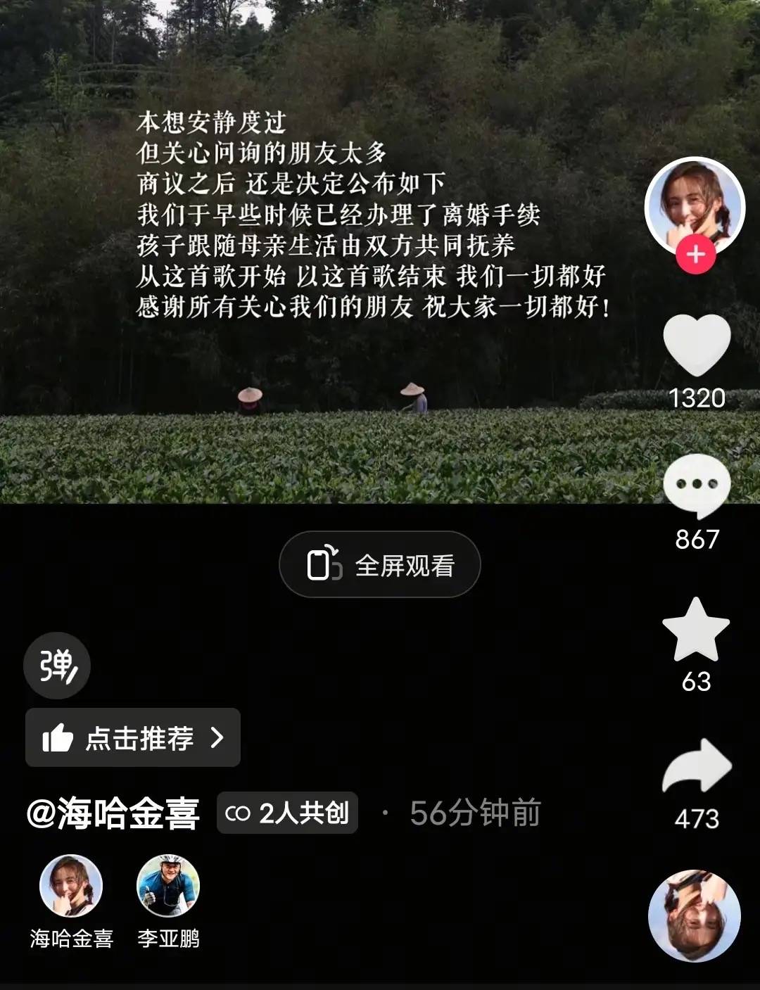 或许分开,对于彼此来说,都是一件好事。李亚鹏有更多的精力投入到茶园、安心的创业。海哈金喜带着女儿,也可以更安静的生活。