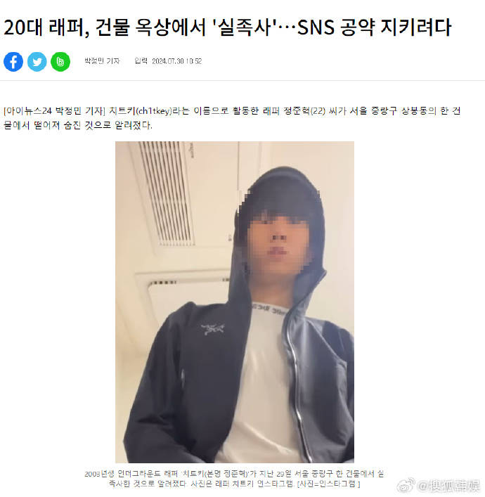 搜狐韩娱讯 20多岁的饶舌歌手郑某在楼顶失足,为了实现1400万粉丝的公约,他在模仿从屋顶边缘掉下来的过程中滑倒,虽然被送到了医院,但最终还是不治身亡。