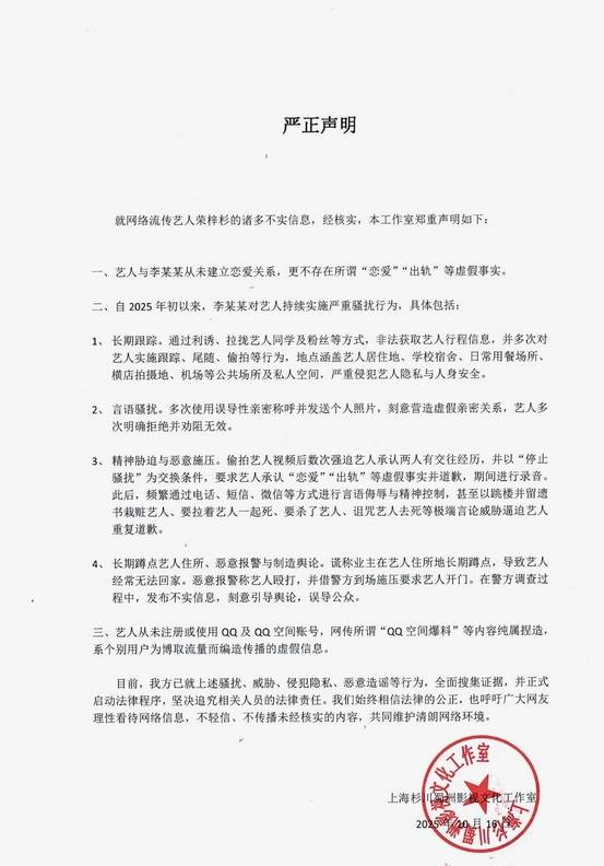 李禹熹声称冲突现场无有效监控,导致取证困难,但有伤情诊断书和警方立案回执,这似乎在一定程度上证明了她确实受到了伤害。而荣梓杉工作室的《严正声明》也不甘示弱,否认恋爱关系,反诉李禹熹骚扰行为,还澄清网络谣言是捏造的。