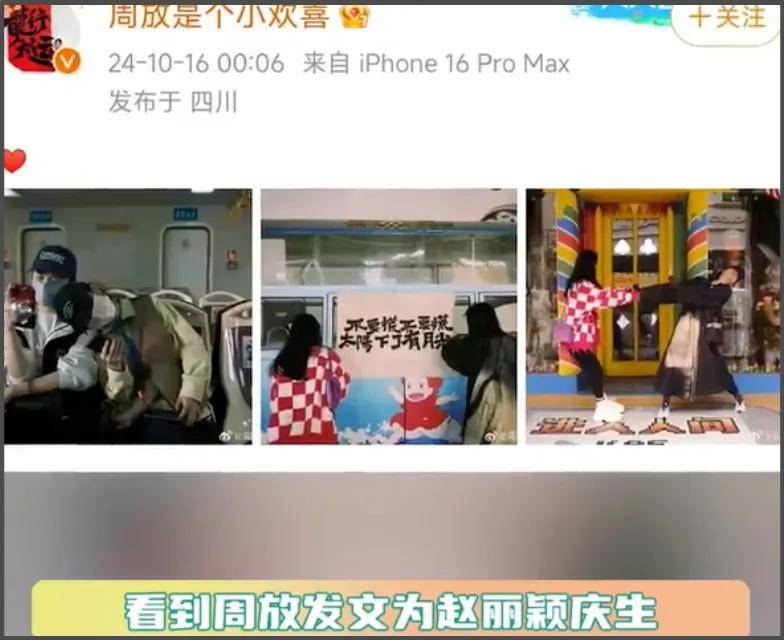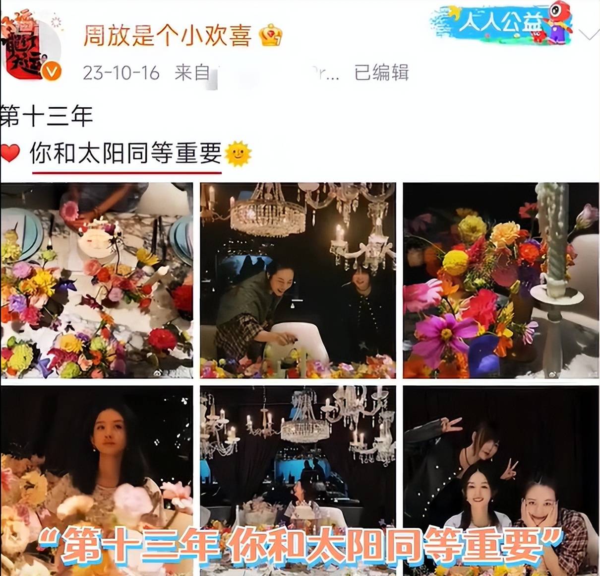 赵丽颖36岁,周放感慨好闺蜜和太阳同等重要;赵丽颖37岁,周放简单放上一颗红心表达情绪,不难发现周放过往给赵丽颖庆生,更多是用照片记录,最新一次生日祝福突然就没了照片,变成了强调爱她和一连串感叹号,难怪会让外界觉得赵丽颖有情况了。