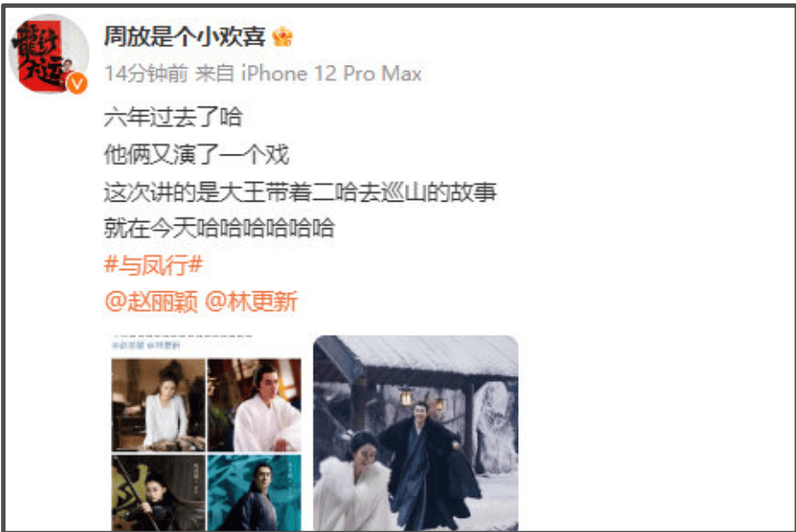 作为赵丽颖的好闺蜜,周放绝口不提赵德胤相关,却乐见于赵丽颖和林更新合作,从《楚乔传》到《与凤行》,周放都第一时间主动宣传,每一次都又要提赵丽颖又要提林更新。