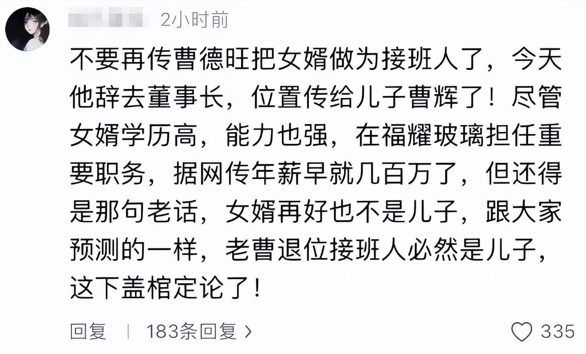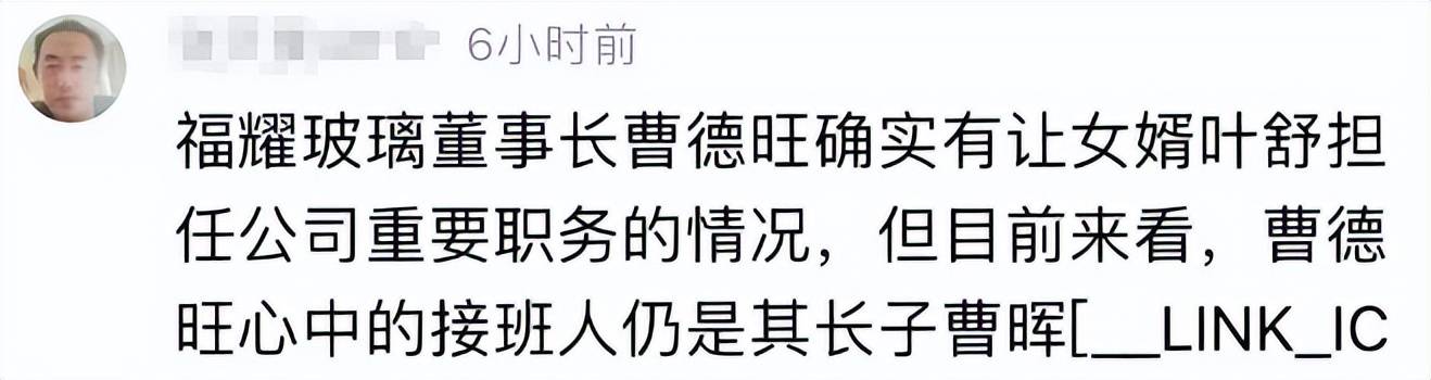 其实在曹德旺把公司交给儿子曹晖之前,很多人都猜测,曹德旺可能会让女婿叶舒接管公司,如今总算尘埃落定。