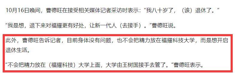 不少网友猜疑,曹德旺从福耀退休,大概率不会抛舍下福耀科技大学 ,对此曹德旺表示自己不会继续在大学上面费心,现已经将福耀科技委派给王树国接受管理 。