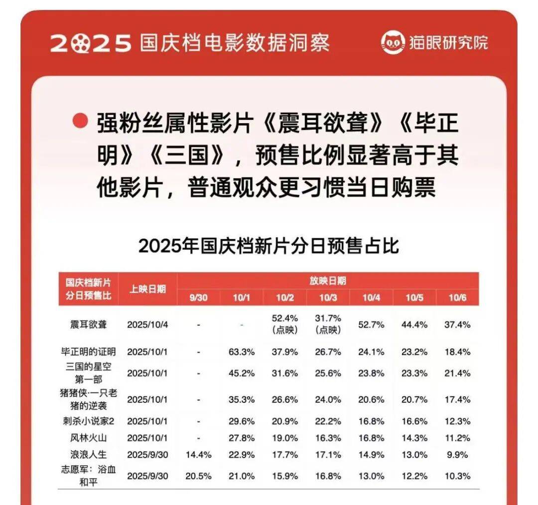 而《震耳欲聋》《毕正明的证明》《三国的星空第一部》预售占比较高,主要得益于檀健次、王安宇粉丝,被定义为“强粉丝属性电影”。