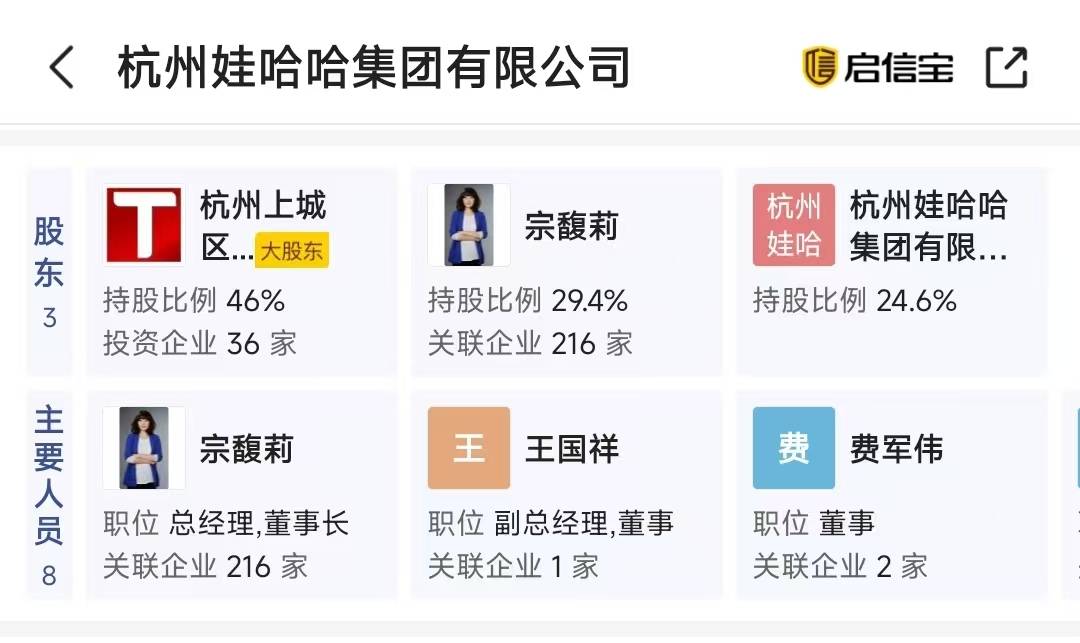 娃哈哈集团三大股东分别为持股46%的国资股东杭州上城区文旅、持股29.4%的宗馥莉及持股24.6%的职工持股会。