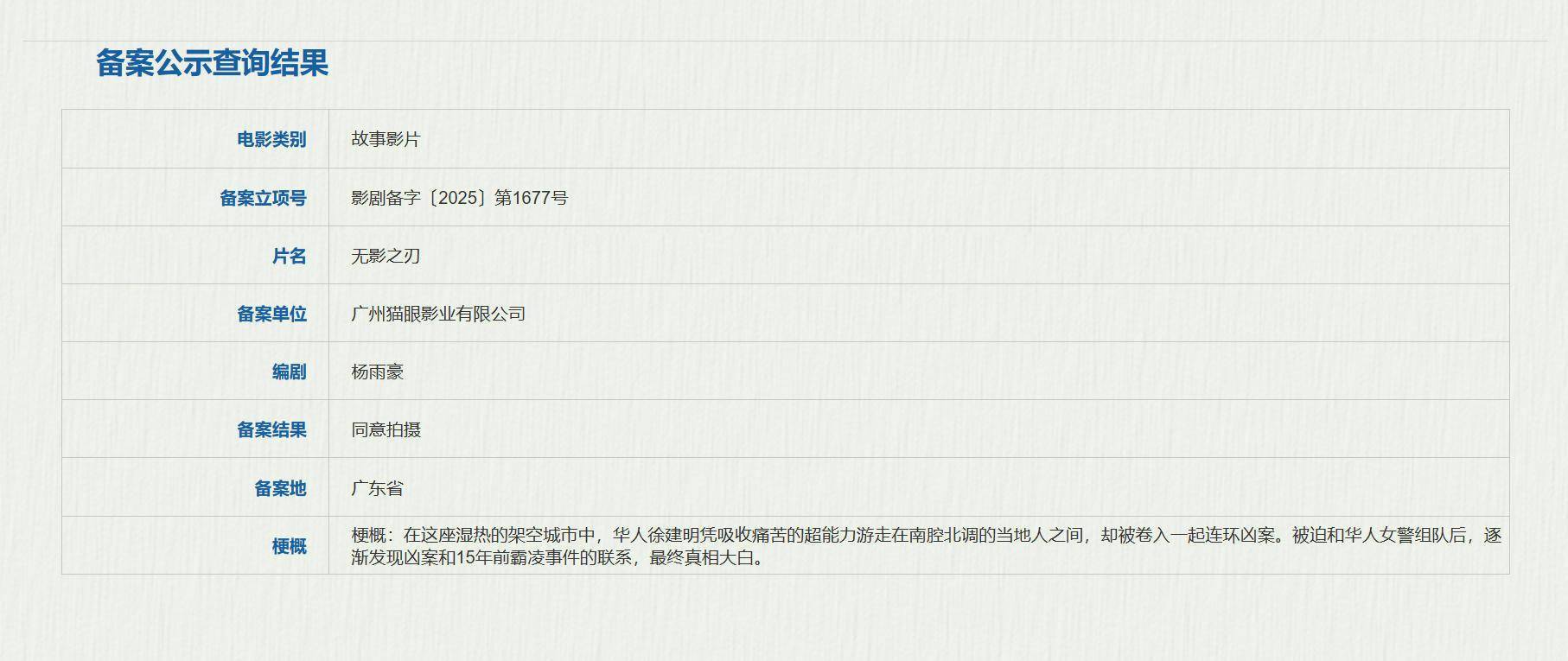 1905电影网讯10月16日,据国家电影局关于2025年9月上全国电影剧本(梗概)备案、立项公示的通知,电影《无影之刃》立项,编剧杨雨豪,备案单位:广州猫眼影业有限公司。影片通过超能力者的视角探讨"痛苦"的本质,将个体创伤(霸凌事件)与社会罪恶(连环凶案)双线交织,暗喻人性救赎。