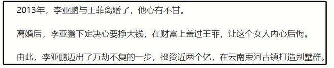 之后李亚鹏和王菲离婚,这种心态就更强烈了,他下定决心要赚大钱在财富上超越王菲,让女方后悔。因此投资近两个亿在云南束河古镇打造别墅群,这个别墅群的结局大家都知道了,因为地处偏僻所以无人问津,到如今更是彻底败落,只给李亚鹏留下一地的债务。