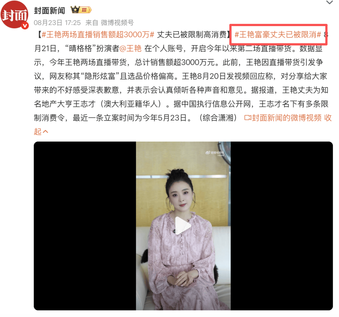 近期随着“王艳丈夫进入限制高消费名单”的话题等上热搜,大众纷纷推测近几年频繁直播的王艳实际上是为夫还债。