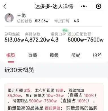 沉寂了近两年时间后,王艳于今年7月26日正式复播,并在30天内进行了两场直播,销售额累计超过3000万。