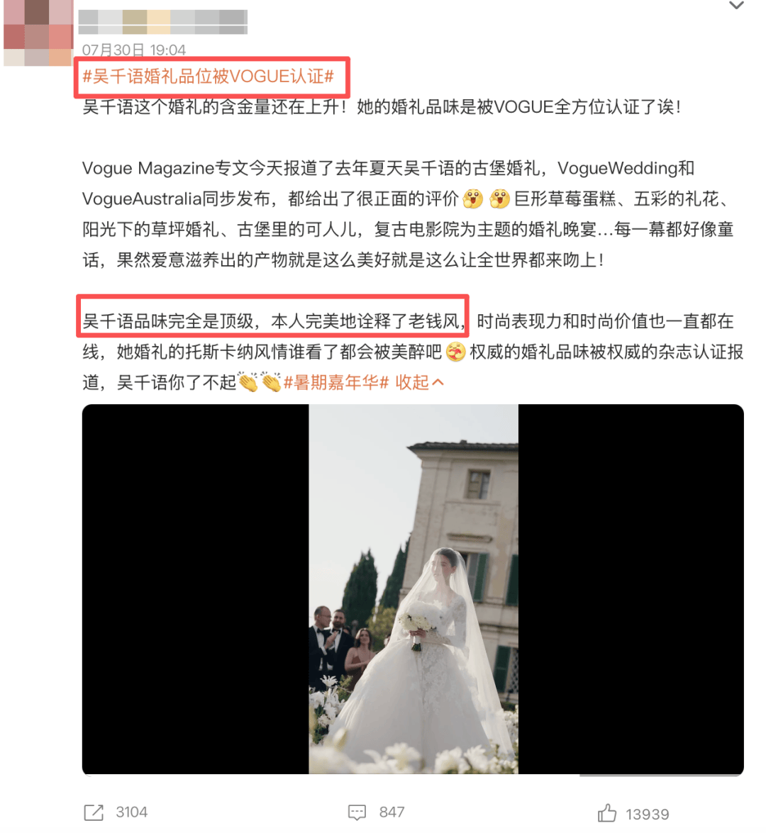 去年7月,二人在意大利一座古堡举办了一场低调但温馨的婚礼。有关这场婚礼,从服装场地到婚纱摄影,都被自媒体研究了个透,用放大镜分析每一个细节的美感。