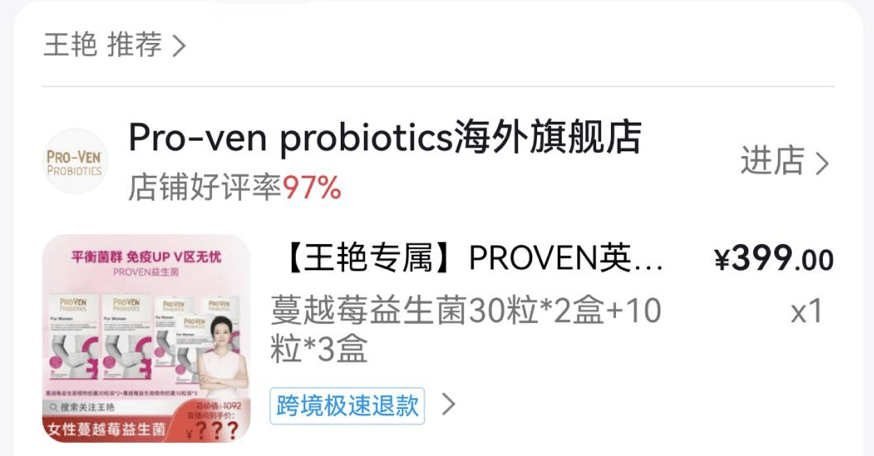原因在于她直播间内某爆款女性益生菌,来自英国某保健品牌,根据某宝该品牌海外旗舰店的商品详情页介绍,主要功效是女性私处调节。